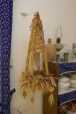 Magyar és román nemzeti szalaggal díszített aratási koszorú a tornyai tájházban. Tornya, 2014. Fényképezte: Szilágyi Levente. |