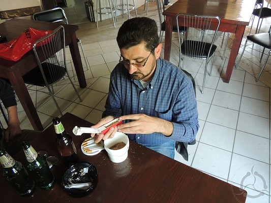 Magyar dohányt sodró román férfi bolgár településen. Óbesenyő, 2014. Fényképezte: Turai Tünde. |