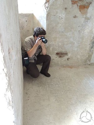 Kutató a terepen. Szilágyi Levente a tornyai kriptában fényképeket készít. Tornya, 2014. Fényképezte: Turai Tünde. |