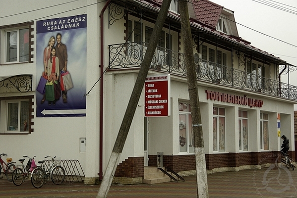 Falusi bolt ukrán-magyar kétnyelvű felirata a román-ukrán határ mellett fekvő Nevetlenfaluban. Nevetlenfalu, 2013. Fényképezte: Szilágyi Levente. |
